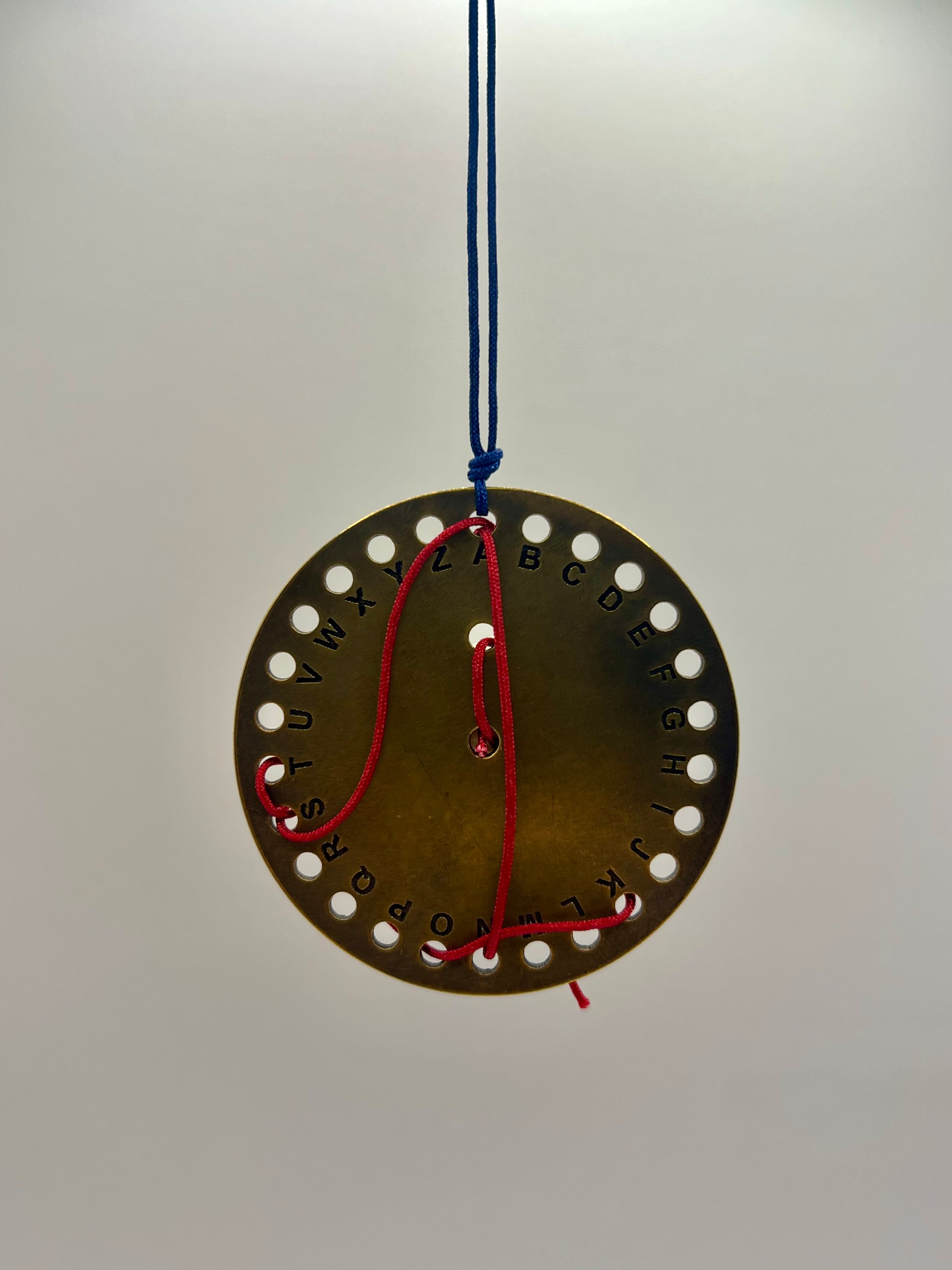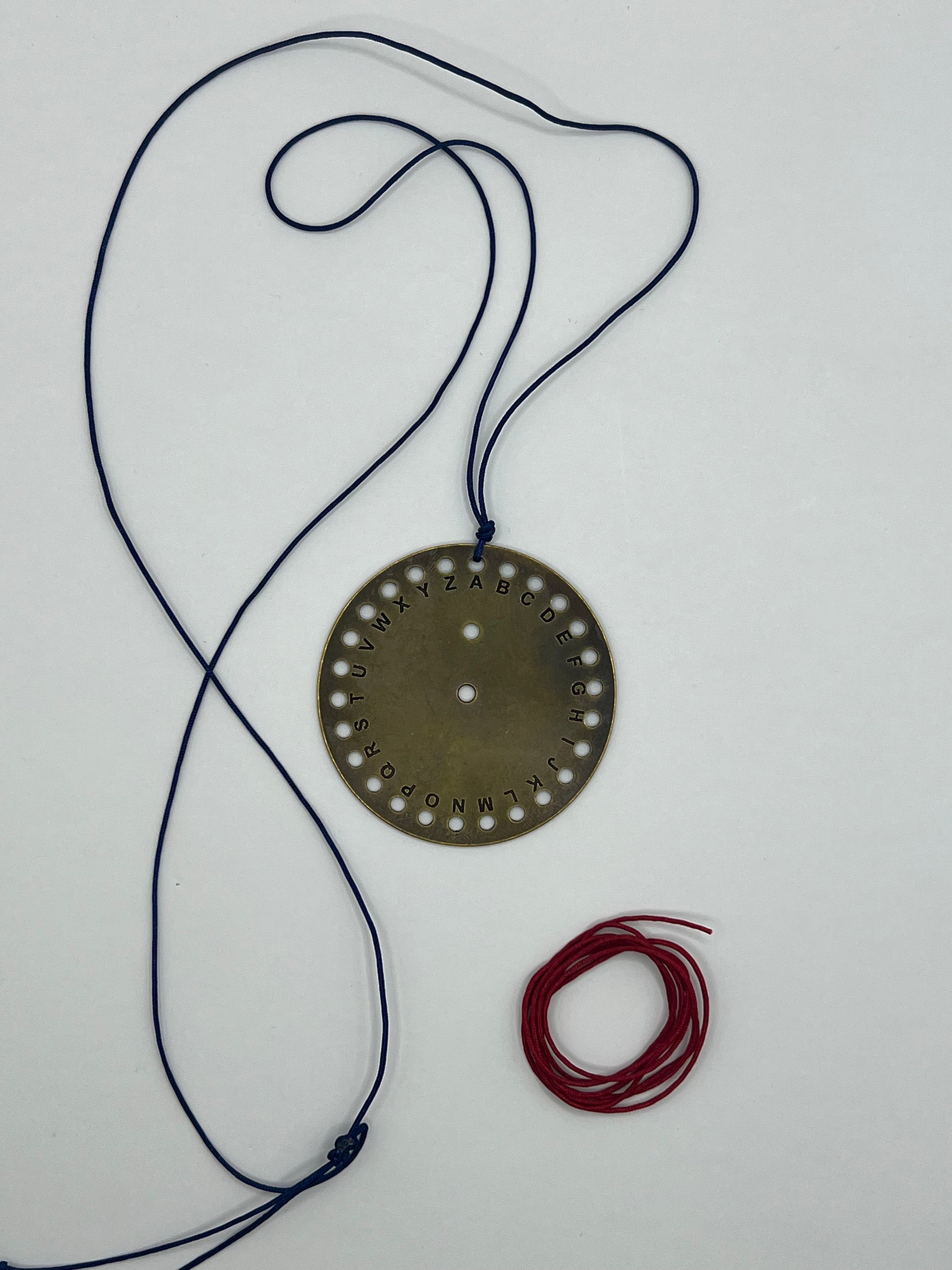 It was a disc with 24 holes (one for each letter of the alphabet) on the periphery, one in the centre and one more defining the letter “A”. The sender formed the message by passing a thin thread through the holes of the relevant letters and the receiver read it by removing the thread and noting the letters from right to left.